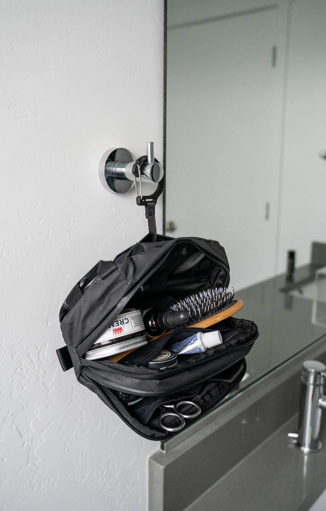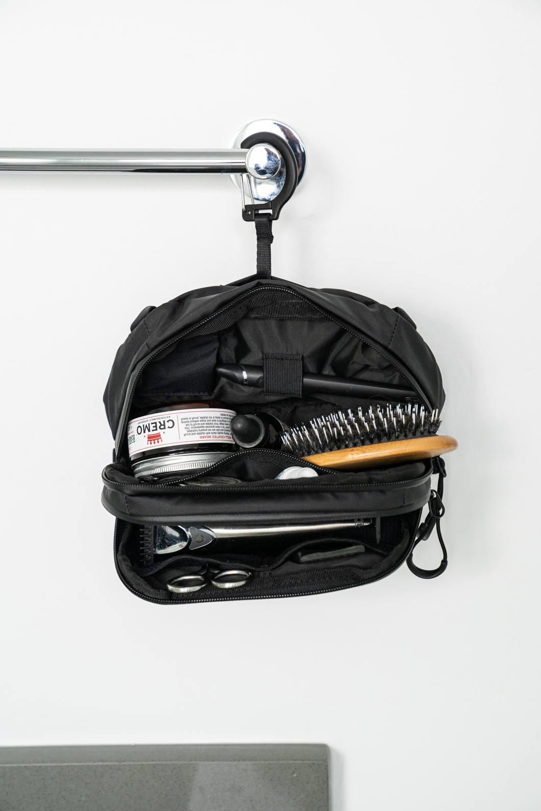 - Pętla z taśmy i system klipsów do integracji z wieloma torbami toaletowymi