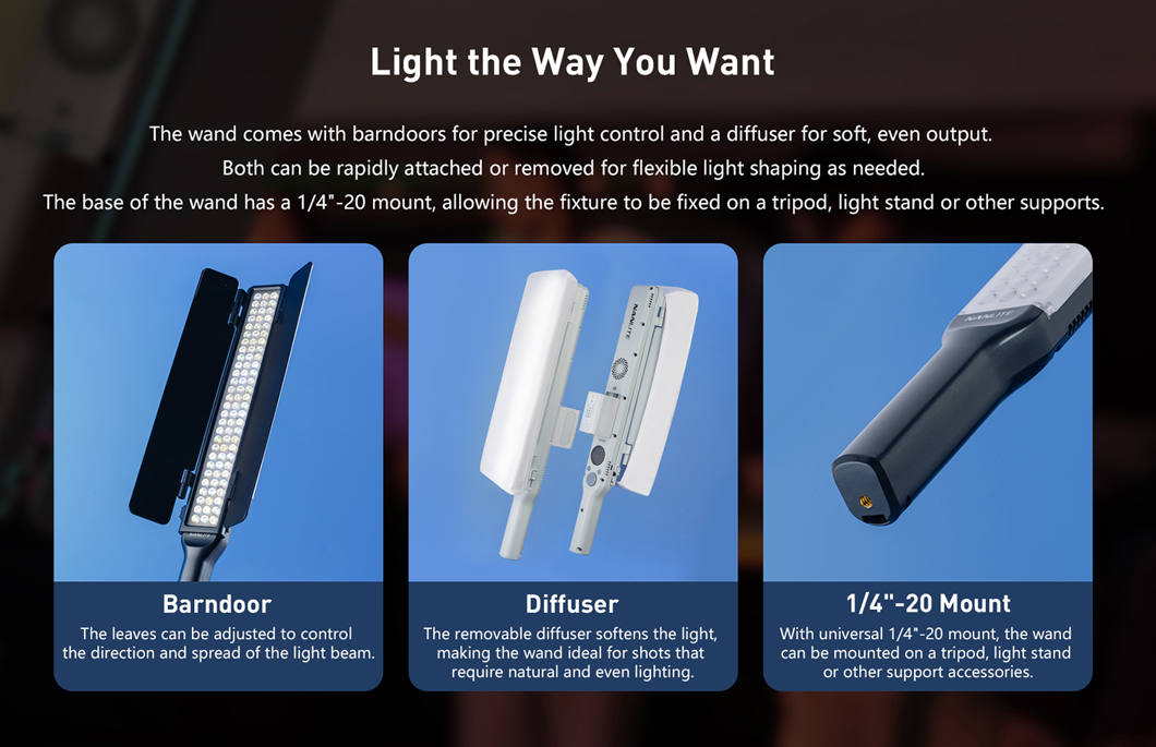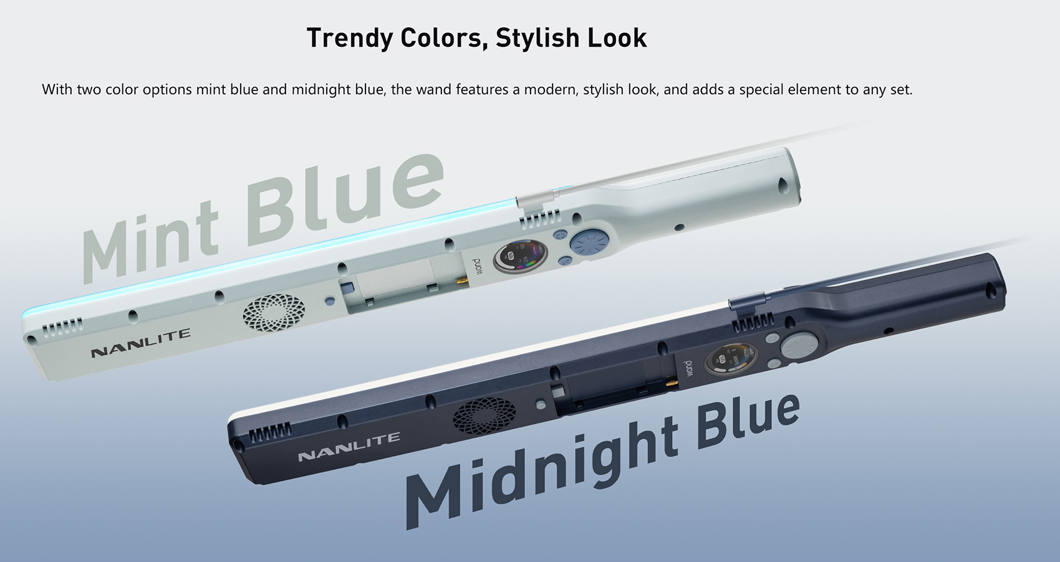 Despite its small size, the Wand delivers strong output with 4020 lux at 1 m (5600K) and 14,150 lux at 0.5 m, with a 45° beam angle. A removable diffuser and clip-on barndoors are included for quick control of softness and spill. Power options include Sony NP-F batteries (approx. 1 h at 100% with NP-F750, 1.5 h with NP-F970) or continuous operation via USB-C PD 3.0 (9–20 V). Wireless control is available through the NANLINK 2.0 app over Bluetooth, and firmware updates are supported in-app. A built-in 1/4″-20 mount in the handle allows easy attachment to stands and accessories. The light measures 49.25 × 5.56 × 3.76 cm, weighs 0.42 kg, and is available in Midnight Blue, with Mint Blue also offered.